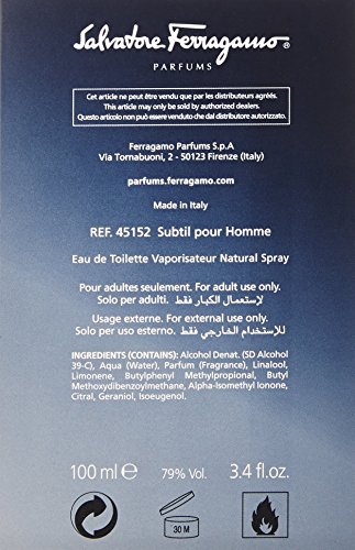 -. Binding : Misc. -. Brand : Salvatore -. Feature : 30-Day 100% Satisfaction Guarantee Return Policy. / 100% Original. / Free Standard Shipping anywhere in the United States on Orders $75 and over. -. HazardousMaterialType : Unknown -. Label : Salvatore -. Manufacturer : Salvatore -. ProductGroup : Beauty -. ProductTypeName : BEAUTY -. Publisher : Salvatore -. Studio : Salvatore -. Title : Subtil Pour Homme Eau de Toilette for Men by Salvatore
