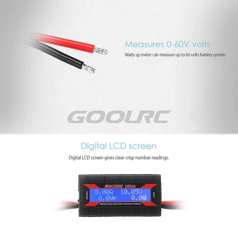 This is a brand new in-the-box GoolRC 150A high-precision watt meter and power analyzer. It measures voltage (V), current (A), power (W), capacity (Ah), and energy (Wh). It also records minimum voltage (Vm), peak current (Ap), and peak power (Wp). Simply plug in between your motor and battery and the watt meter displays the actual values used when running for voltage (V), power (W) current (A) and charge quantity (mAh). Get your electric power systems running at their peak and enjoy your hobby to the full with a watt meter!