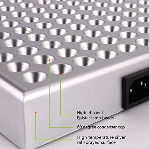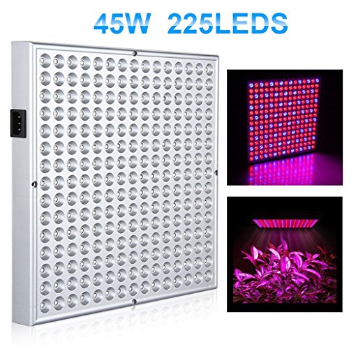 - 225 LED's; 165 Red LED lights (660 nm wavelength) + 60 Blue LED lights (465 nm wavelength), 660 and 430nm; 630 and 465nm are respectively 4 peaks of growth spectrum for maximum chlorophyII A and B production. Red and blue light have the best contribution on photosynthesis, effect directly of plants growth