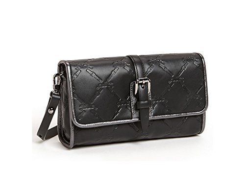 -. Feature : Debossed cowhide leather body with gunmetal tone hardware and metallic cowhide trim / Front flap secured with magnetic snap tab closure / Non-functional buckle detail on flap / Slip pocket across the back and a detachable and adjustable shoulder strap / Fabric lining with 1 roomy compartment and a zipper pocket with a signature designer plaque.