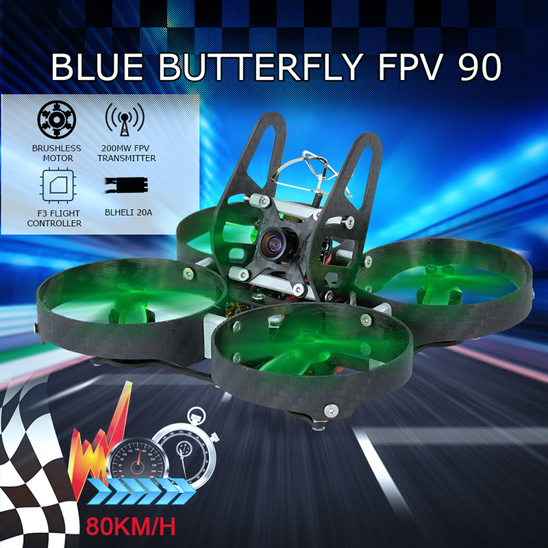 This Blue Butterfly 90 is a small but very powerful racing quadcopter. With only 90mm wheelbase, it's equipped with 4-in-1 BLHeli 20A ESC and 1106 7500KV brushless motor, which support 2-4S LiPo battery so that it can be super violent and achieve a top speed of 80km/h. It's also equipped with F3 flight controller with OSD and 5.8G 25mW / 200mW switchable 700TVL transmitter camera, provides you extraordinary FPV racing experience.