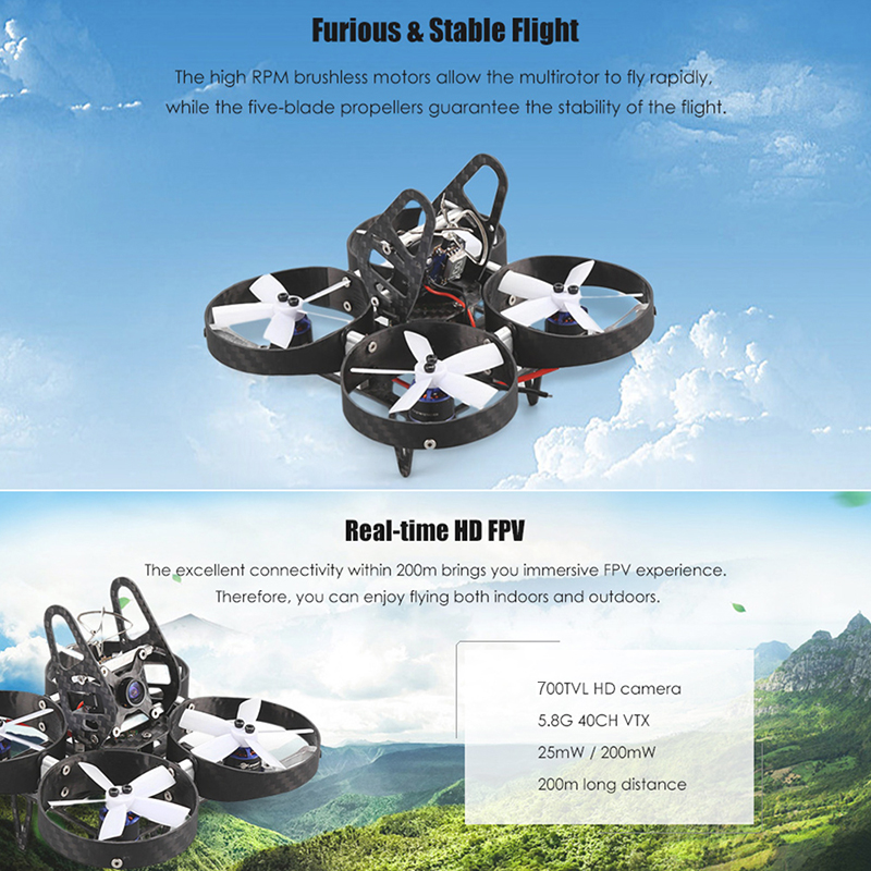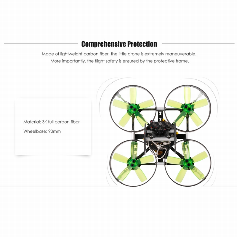 1106-7500KV brushless motors with 4-in-1 BLHeli 20A ESC create amazing power and efficiency to meet even the most demanding racing requirements.