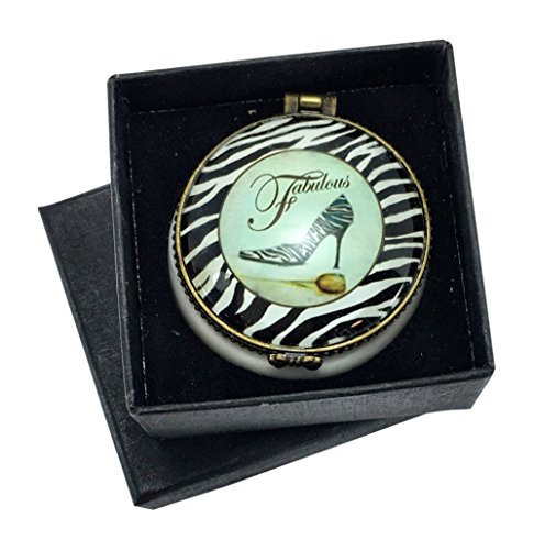 - Glass lid has an image of a zebra print high heel shoe with the word the word "Fabulous".