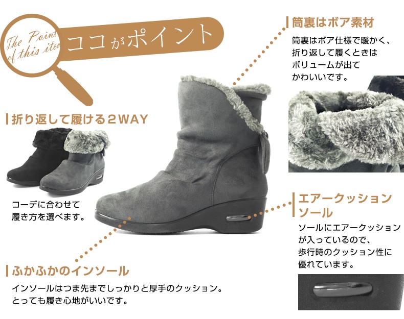 | ポイント | 【あすつくOK】 ◆Alufort エアソール バックリボン 2WAY スエードブーツ◆ ブラック・グレーの合わせやすい定番の2カラー。 バックの大き目リボンがワンポイントに。 スカートでもパンツでも気軽に合わせられます。 筒裏はボアで暖かく冷気の混入を防ぎます。 ふかふかの厚手クッションが踵からつま先まで入っており 更にエア入りソールが履き心地を高めてくれます。 ※撮影は室内で行われており、ライティングにより実物と色味が少し異なる場合がございます。 ※採寸はスタッフが手作業で行っており、少々の誤差が生じる場合がございます。 | |||||