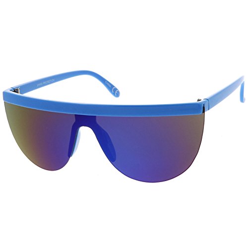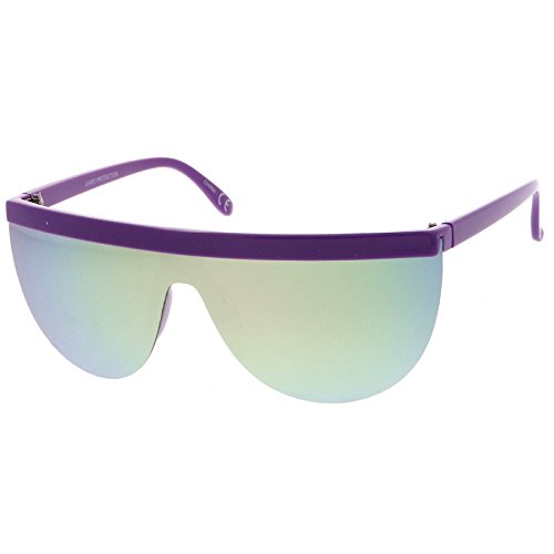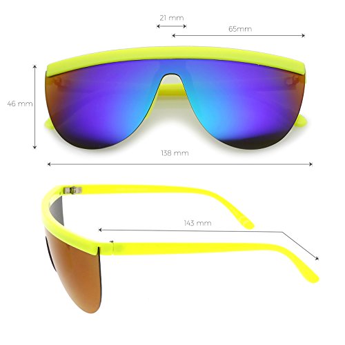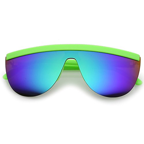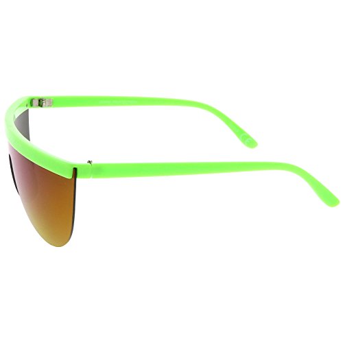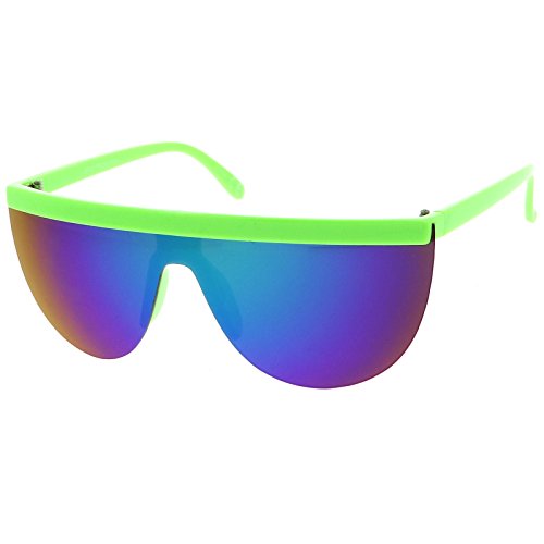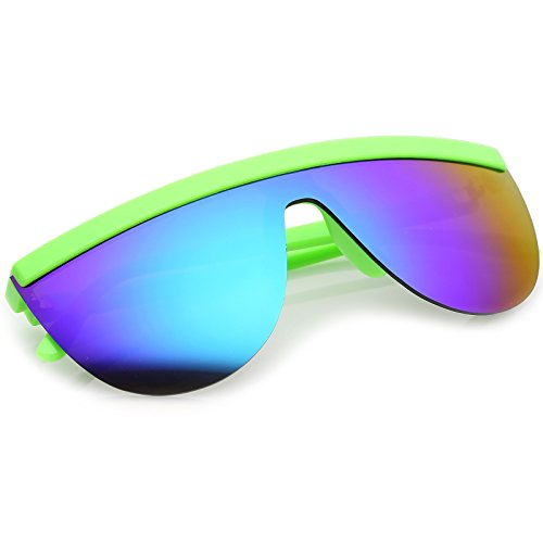 DetailsStep into the future with these shield aviator sunglasses featuring a semi-rimless frame and flat top design for a sleek finish. Accented with a colored mirror mono lens and designed in neon hues, these flashy shield aviator sunglasses are perfect for making a bold statement. Made with a plastic based frame, metal hinges, and reflective 100% UV protected lenses.