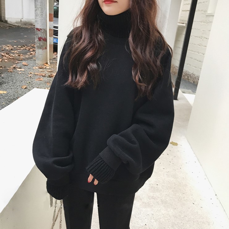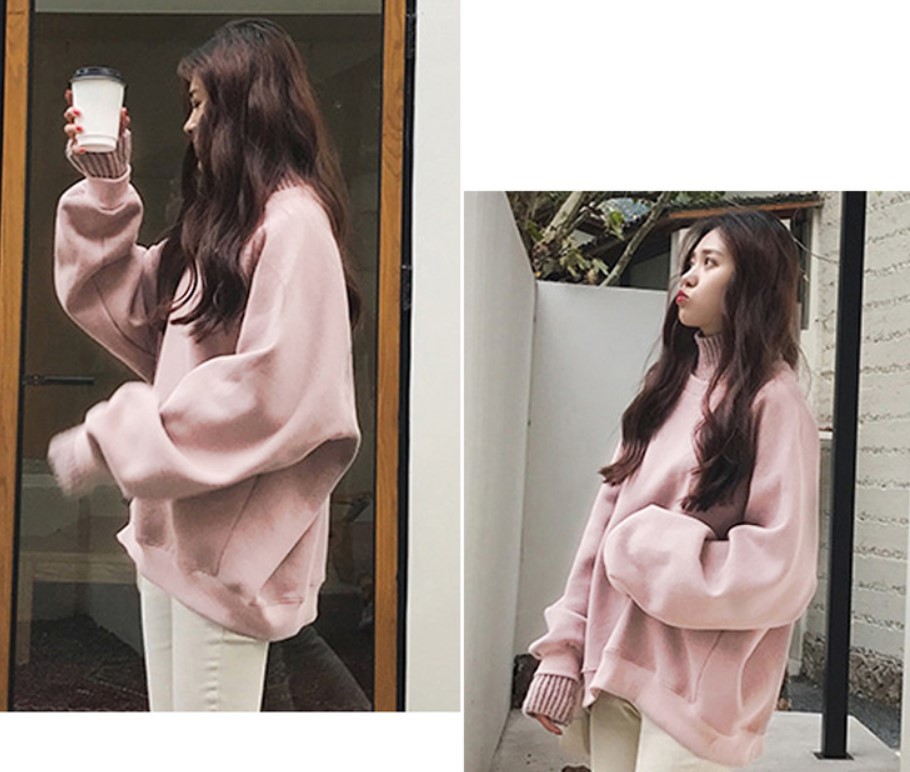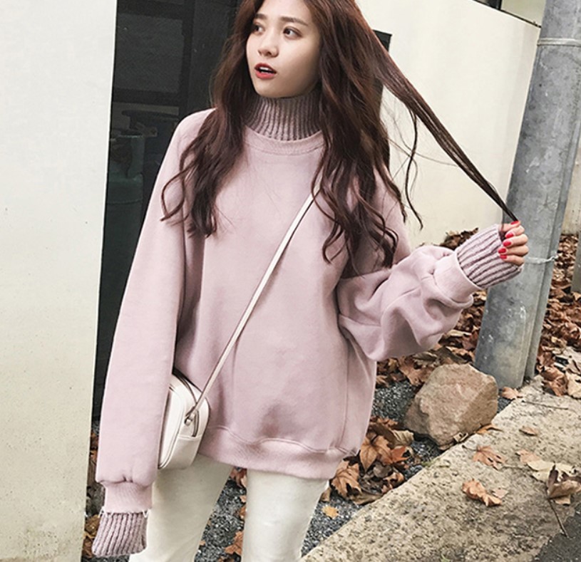 リブ編みニットのハイネックと袖口のスウェット。