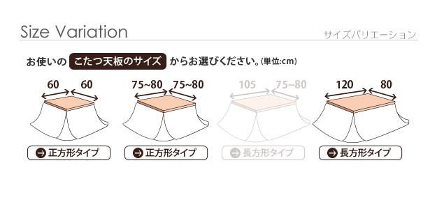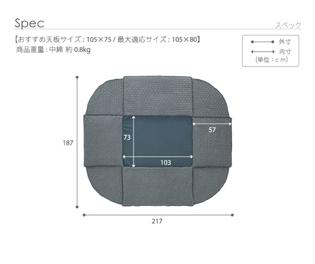 オススメこたつサイズ:105x75cmサイズ:220x190cm・中綿量約0.8kg