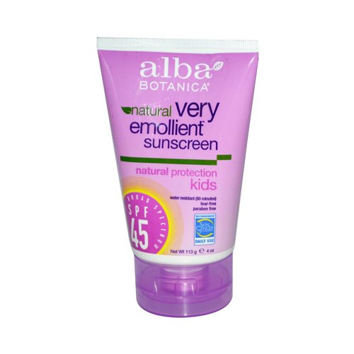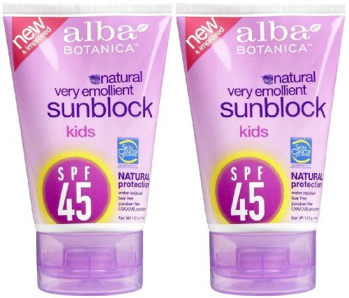 Alba Botanica SPF 45 Sunblock for Kids, 4 Ounce -- 2 per case. ingredient: An infusion of certified organic lavender, aloe vera, chamomile, ginkgo biloba, and green tea soothes and repairs, protecting sensitive skin against the free radical damage that often results from exposure to the sun. Product description: Renovated and improved with higher sun protection factors and enhanced natural technology for ultimate sun protection and skin care benefits. Features and benefits: -- Water resistant & durable for active kids. -- Paraben Free. -- Tear free. -- Hypo-allergenic. -- Long-lasting UVA/UVB protection. -- Skin Cancer Foundation Recommendation. -- Fast-absorbing, lightweight formula with fun, fruity fragrance. -- Certified organic Aloe Vera and Calendula to nourish and soothe skin. -- Green Tea and Vitamin E provide rich antioxidant protection. -- Ginseng revitalizes and energizes the skin. Shlef Life: 999 days 4 Ounce