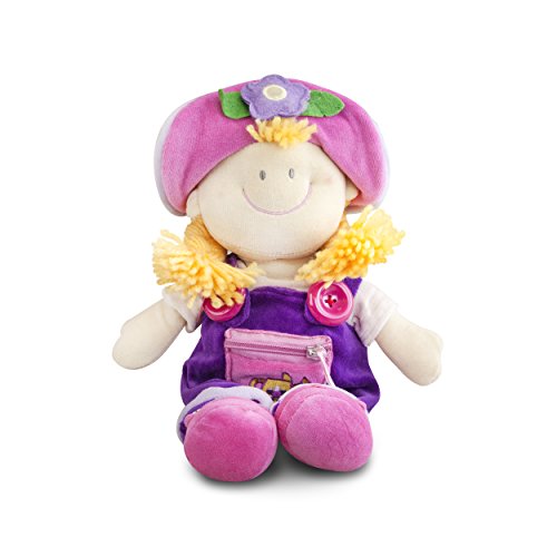 Learning to dress is made fun for little ones to master with this activity doll. With laces to untie, a zipper to unzip, snaps and buttons to be undone and clothes to be removed, this doll is sure to become a child's best friend. Made of Soft velour and embroidered face. Comes with RUSS Kids hangtag and is surface washable.
