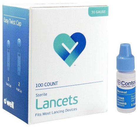 -. Binding : Health and Beauty -. Brand : OWell -. EAN : 0759526638692 -. Feature : For use with Bayer Contour Glucose Monitoring Systems and NOT Bayer Contour Next / INCLUDES: 1 bottle of Bayer Contour control solution + OWell 30g Lancets 100 Count. / PROVIDES: Testing to diabetic test strips to insure that your test strips will provide you with accurate results. / QUALITY: LONG LASTING & FRESH EXPIRATION DATES. / SATISFACTION GUARANTEE: We provide 100% customer satisfaction to each Owell TM product. -. IsAdultProduct : 0 -. Label : OWell -. Manufacturer : OWell -. MPN : MED-OW-A102-CS+OW100L -. PackageQuantity : 1 -. PartNumber : MED-OW-A102-CS+OW100L -. ProductGroup : Health and Beauty -. ProductTypeName : HEALTH_PERSONAL_CARE -. Publisher : OWell -. Studio : OWell -. Title : OWell Bayer Contour Control Solution and Blood Glucose Lancets for Diabetic Testing -. UPC : 759526638692