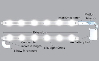 Under light includes “2” connectable LED light strips, a battery Pack, motion sensor/timer and elbow connector.