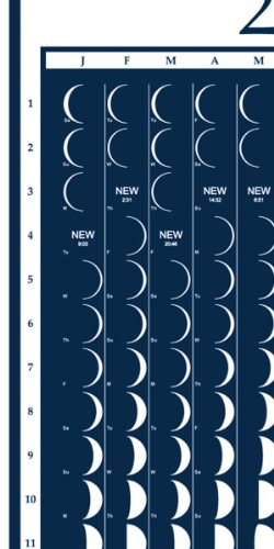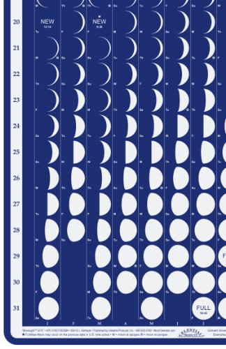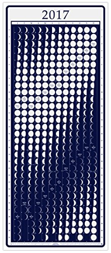 -. Feature : Moon Calendar Size: 16" x 36.5". Made in USA. / Accurate daily phases of the moon keyed to date and day of the week. / Silver moons on dark blue background. / Full and New Moons shown in Universal Time (usable around the world) / Includes MoonWatcher guide for eclipses, blue moons, supermoons, apogee, perigee, etc.