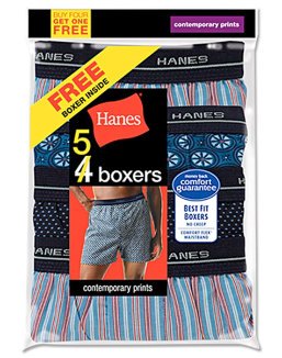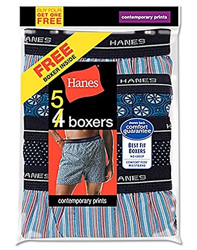 -. Binding : Apparel -. Brand : Hanes -. ClothingSize : * -. Color : * -. Department : mens -. Feature : These best fit boxers are famous for comfort and value / All-over graphic prints and stylish colors / From every day wear to working out, ultra-soft, smooth exposed elastic comfort flex waistband won't pinch or bind / Traditional cut boxer style / Functional fly that won't gap -. Label : Hanes Red Label Underwear - Bottoms -. Manufacturer : Hanes Red Label Underwear - Bottoms -. Model : 832BX5 -. NumberOfItems : 1 -. PackageQuantity : 1 -. ProductGroup : Apparel -. ProductTypeName : UNDERWEAR -. Publisher : Hanes Red Label Underwear - Bottoms -. Size : One Size -. Studio : Hanes Red Label Underwear - Bottoms -. Title : Hanes Red Label Men's 5-Pack Printed Woven Exposed Waistband Boxers