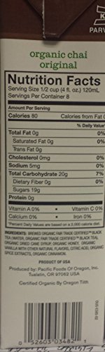 -. Feature : 6 Pack of 32oz Barista Series Organic CHAI LATTE Concentrate by Pacific Natural Foods / Our handcrafted, premium concentrate starts with brewed, Fair Trade CertifiedTM organic black tea. / We combine it in small batches with aromatic spices, honey and vanilla to create a full-bodied, slightly sweet flavor profile you guests will love. / SUITABLE FOR THESE SPECIAL DIETS: Vegetarian Diet, Lower Sodium, Kosher Parve, Fat Free, Gluten Free, Dairy Free, Soy Free, Wheat Free, Yeast Free.