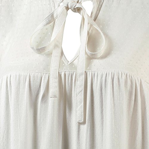 -. Feature : Polka dotted mesh lace yoke with short sleeve ruffle and neck tie at front neck keyhole, tiered high-low hem / Metal plate at hem / Hips 33 at front, 35.25 at back