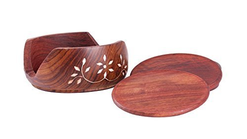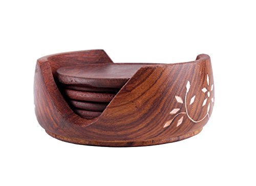 Wooden Round Drink Coasters Set of 6 with Decorative Holder Tabletop Coasters for Tea Coffee Cups Mugs Beer Cans Bar Glass Indian Handicrafts