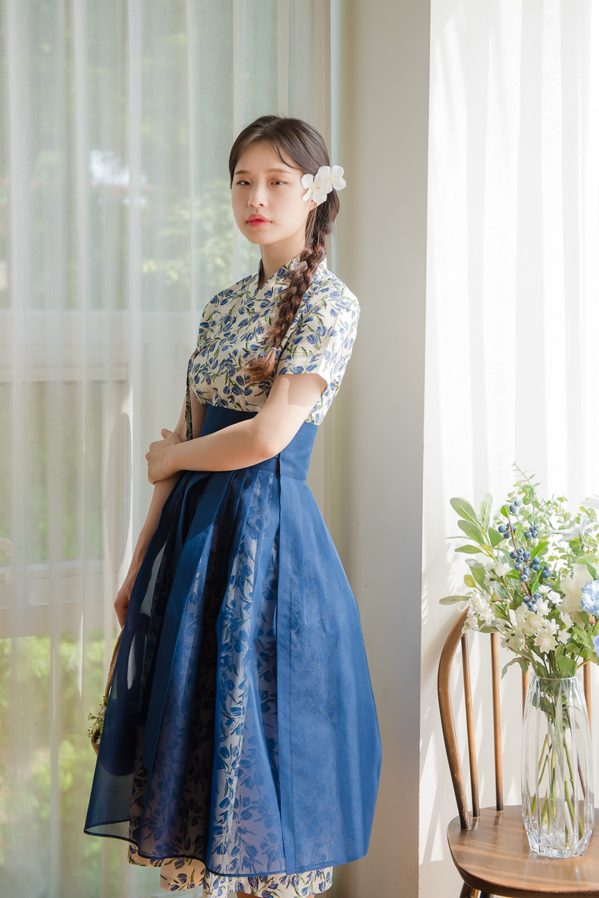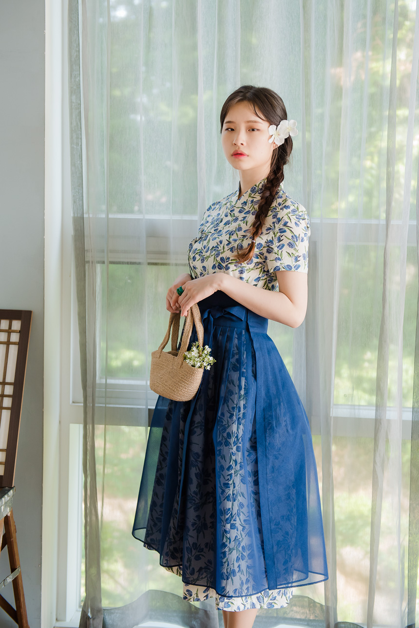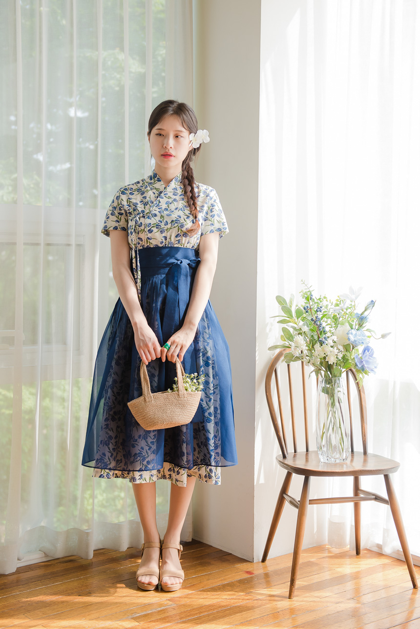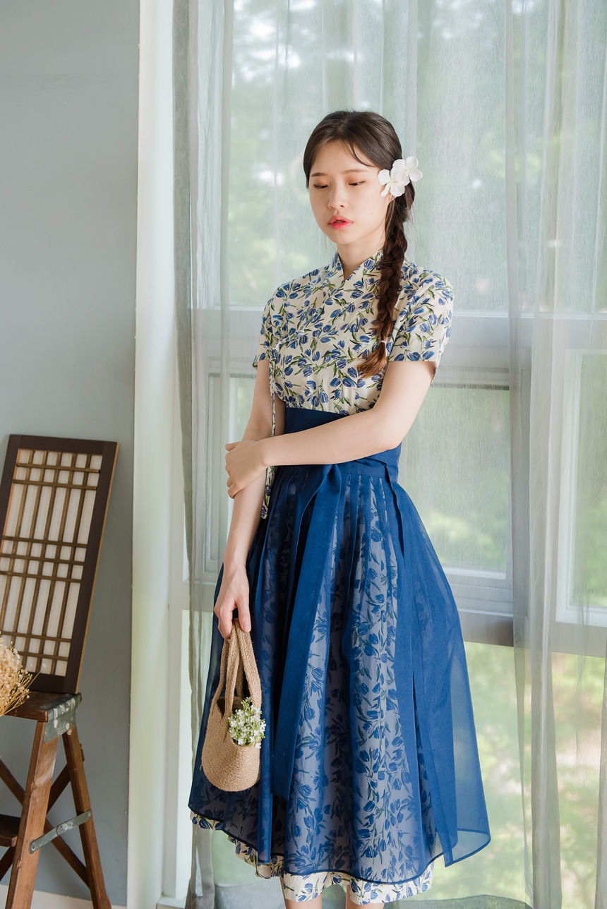시스루 덧치마와 함께 코디하시면 원피스의 꽃무늬가 살짝씩 보이는 청초하고 신비로운 한복룩을 완성하실수 있답니다.
