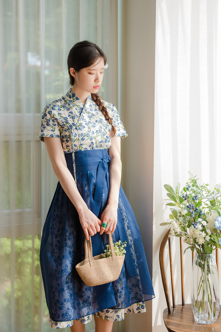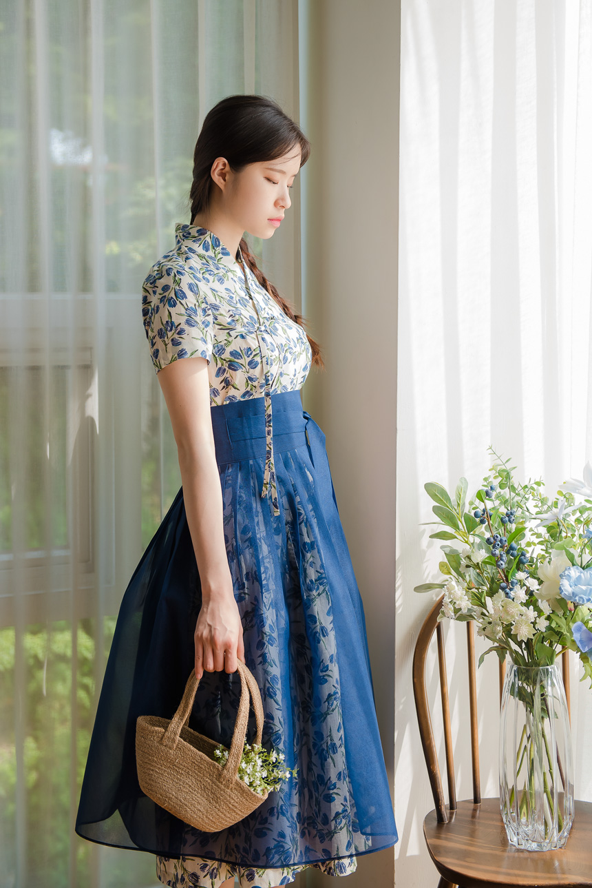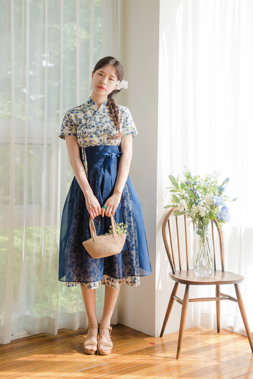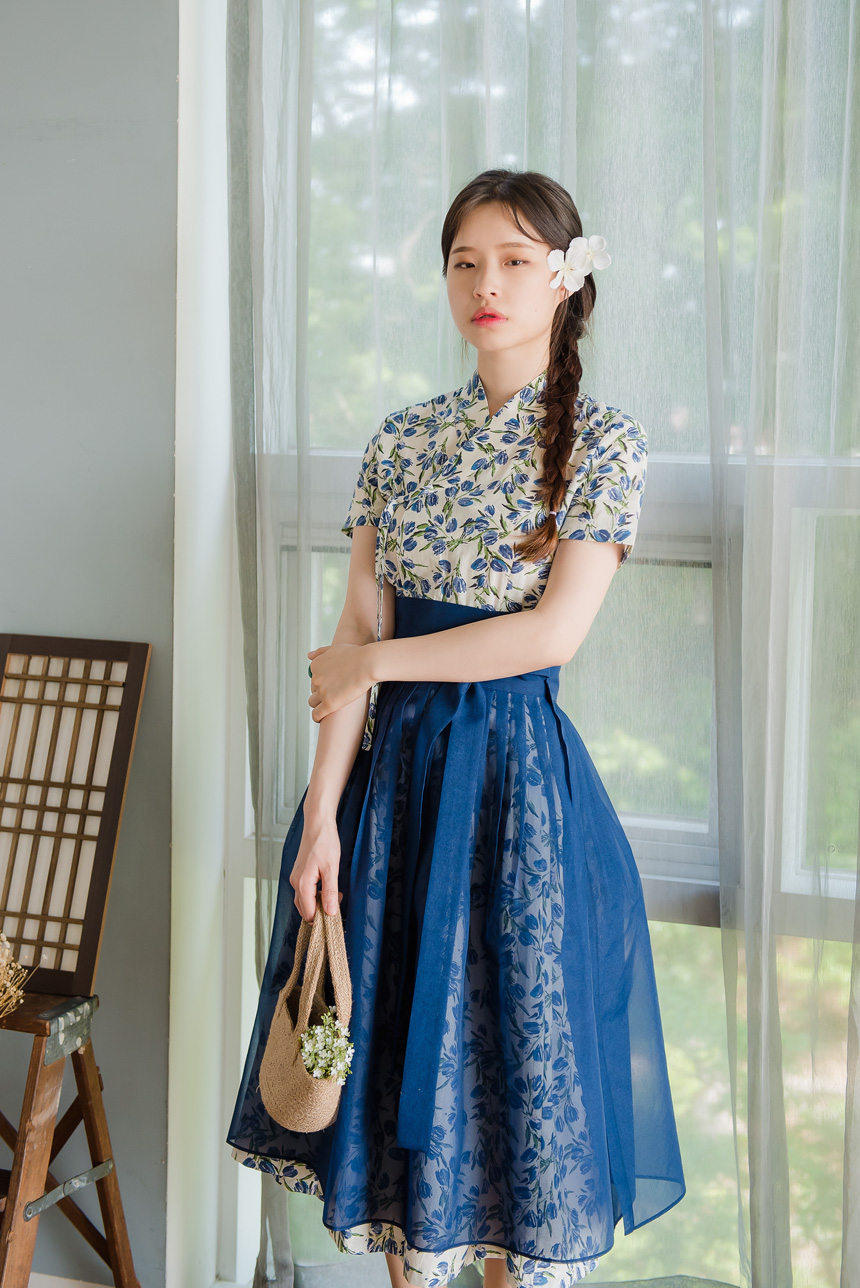 시스루 덧치마와 함께 코디하시면 원피스의 꽃무늬가 살짝씩 보이는 청초하고 신비로운 한복룩을 완성하실수 있답니다.