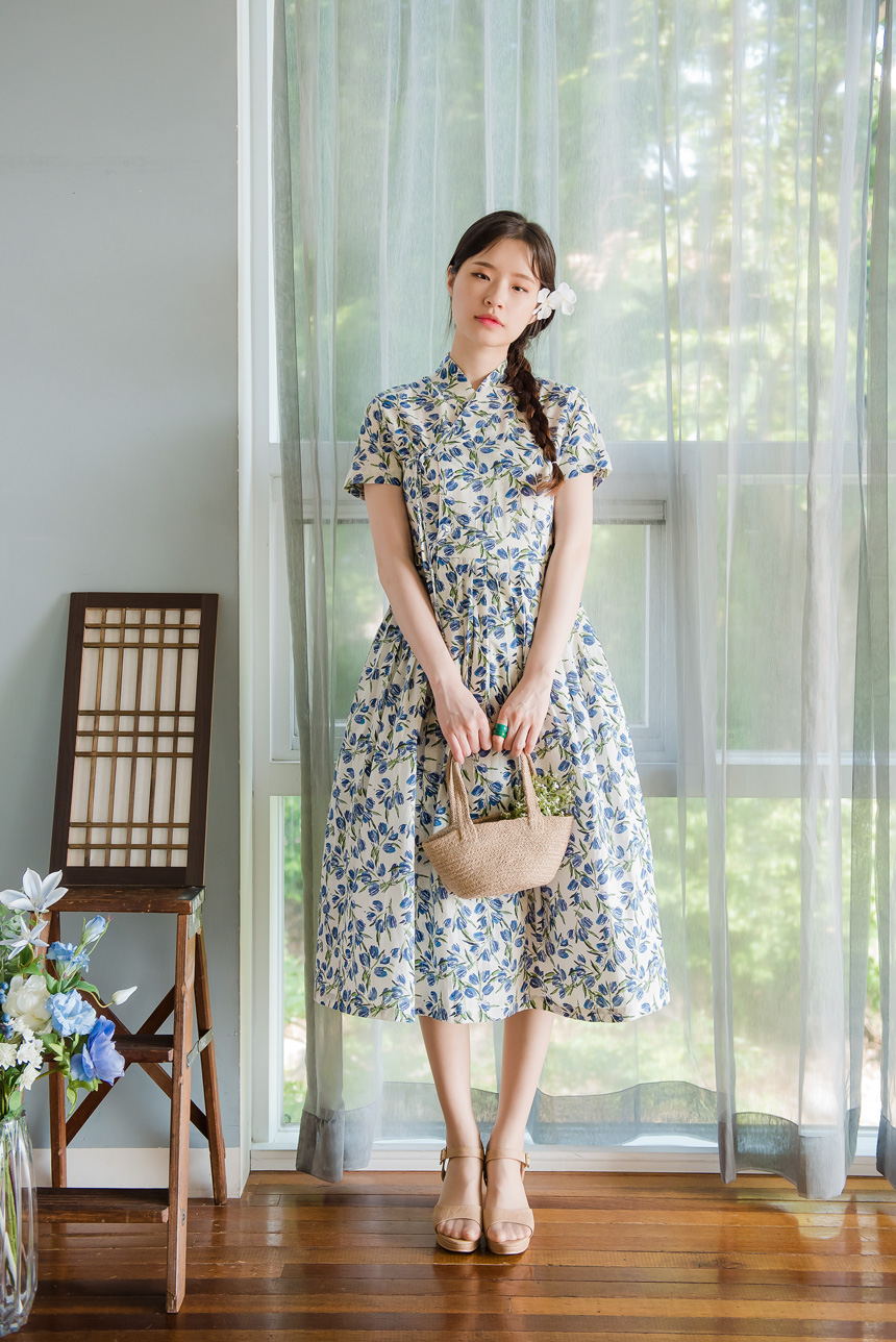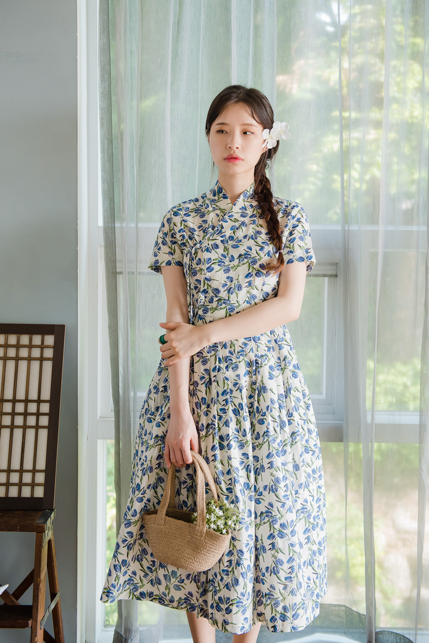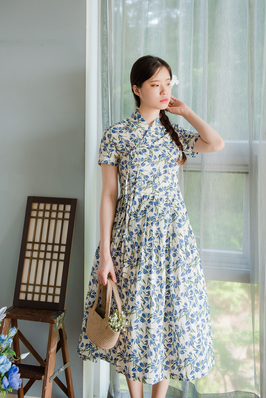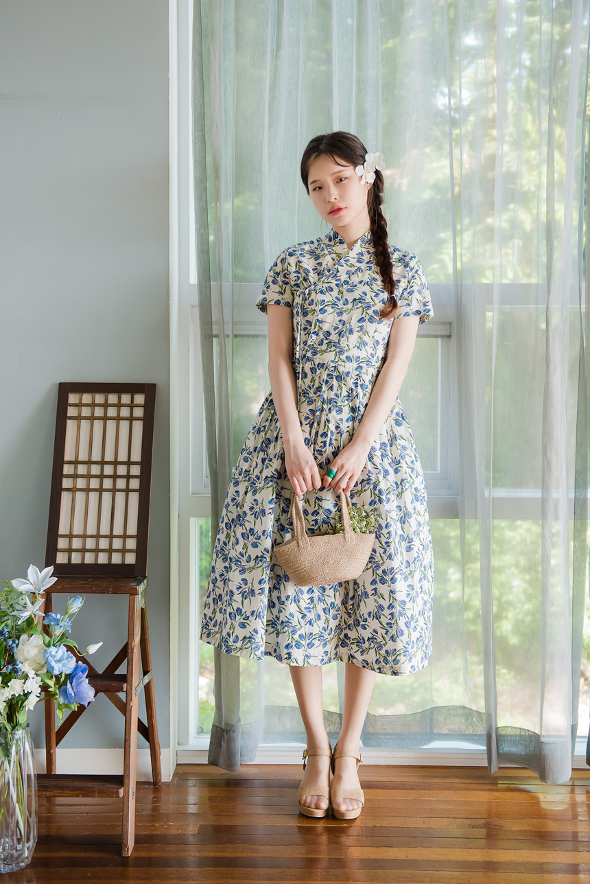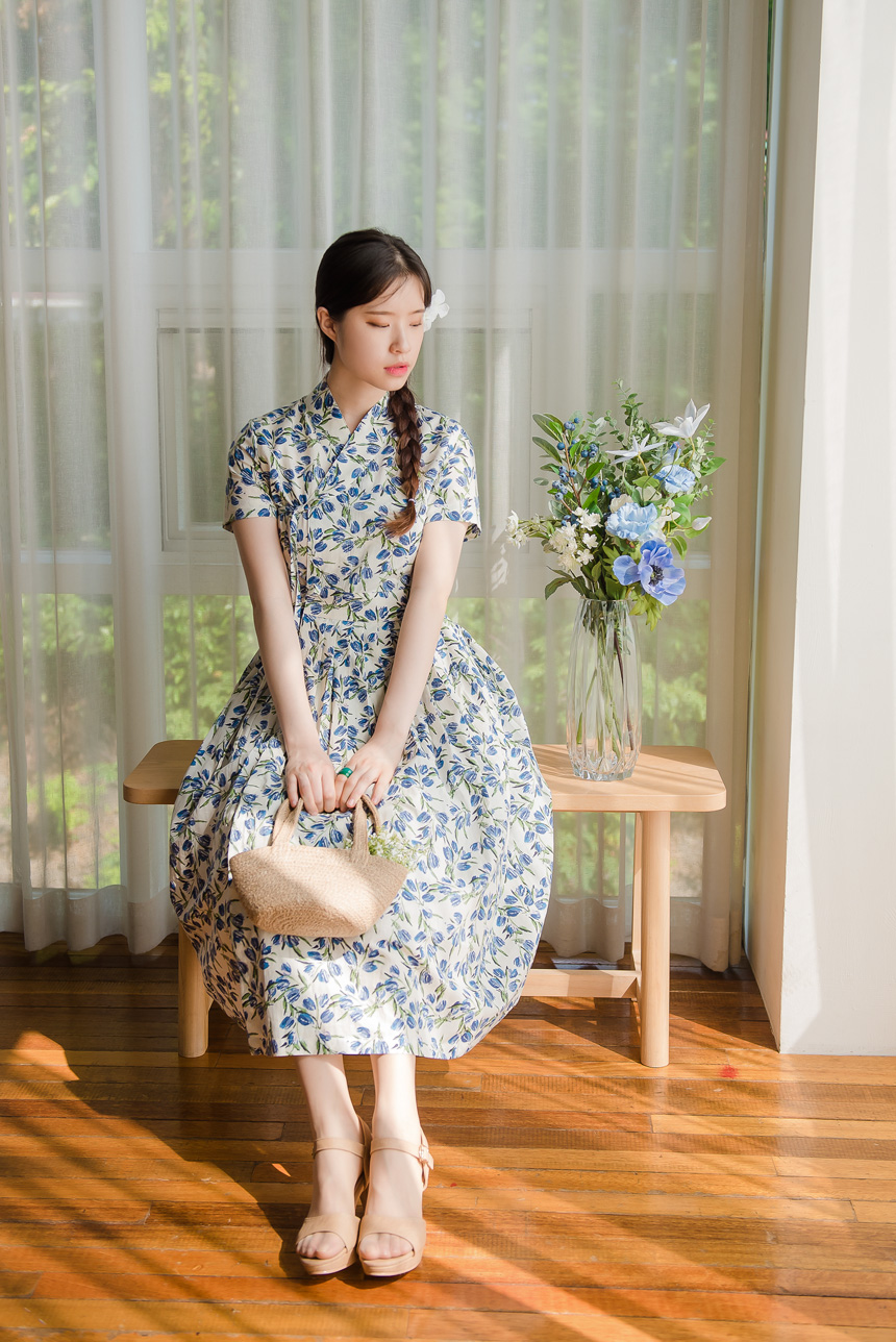 내츄럴한 아이보리빛 바탕에 푸른꽃과 초록잎이 그려져있는 철릭원피스로