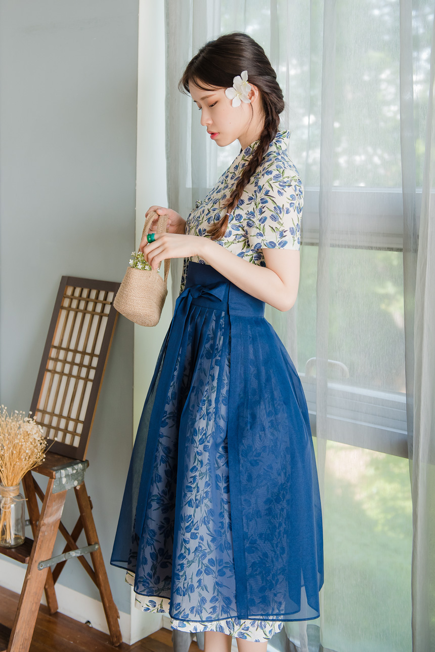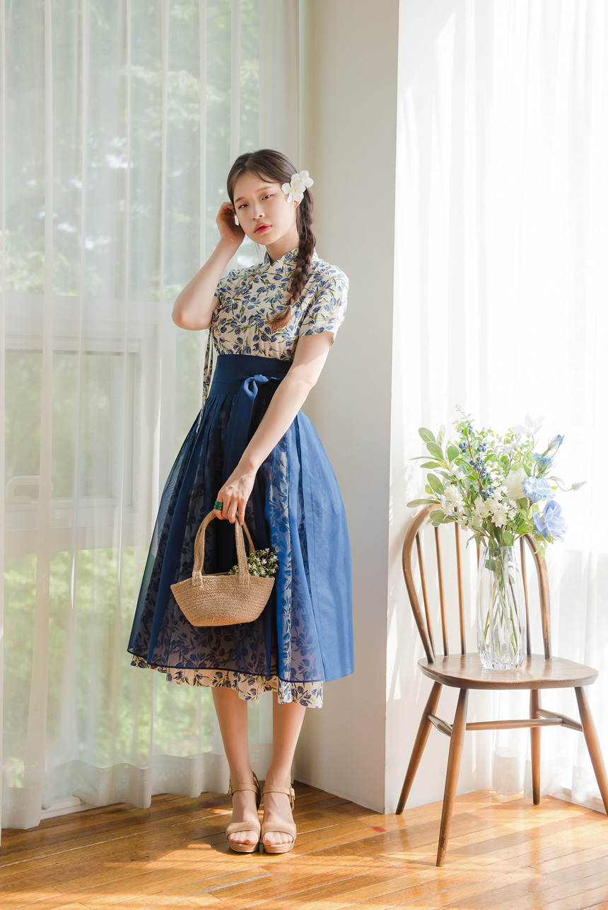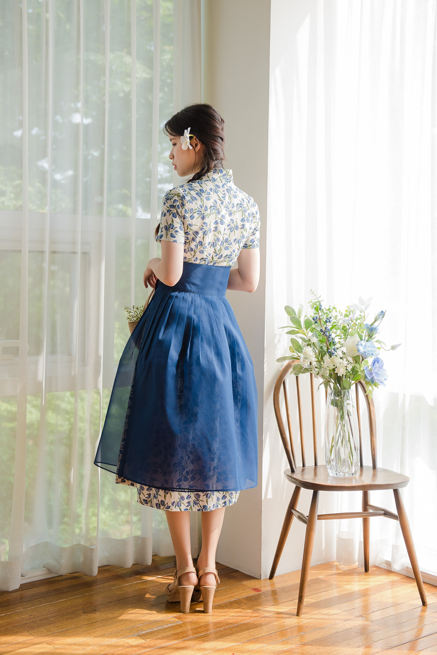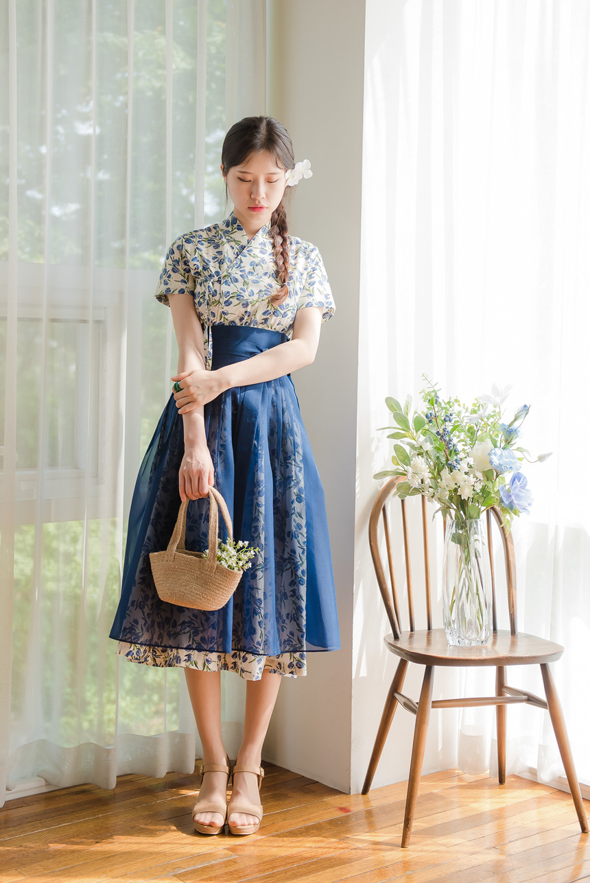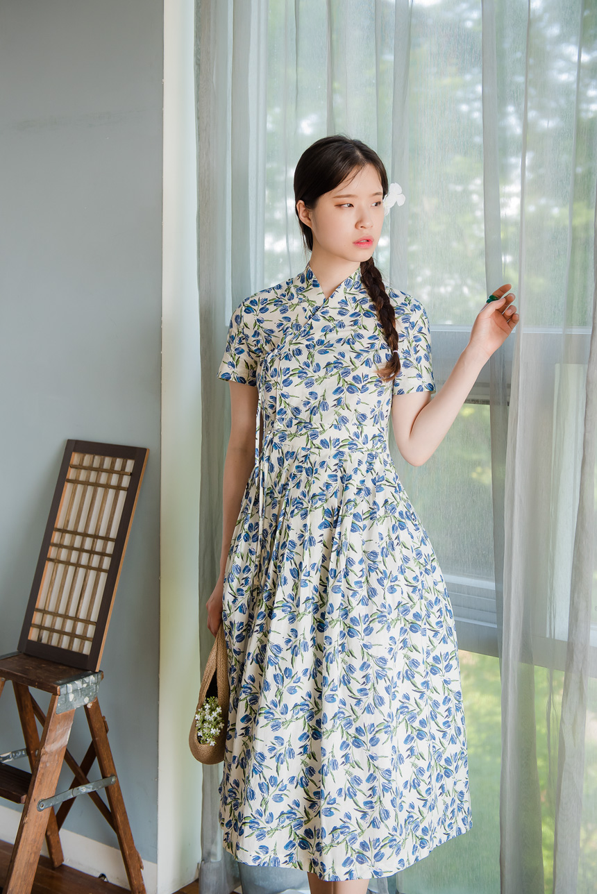 내츄럴한 아이보리빛 바탕에 푸른꽃과 초록잎이 그려져있는 철릭원피스로