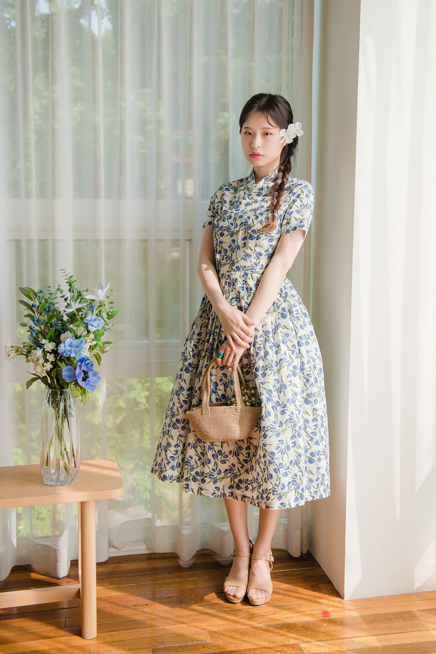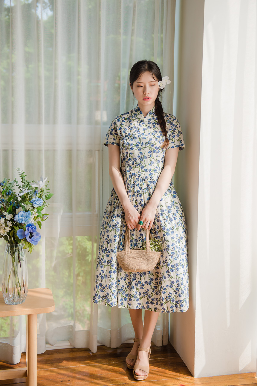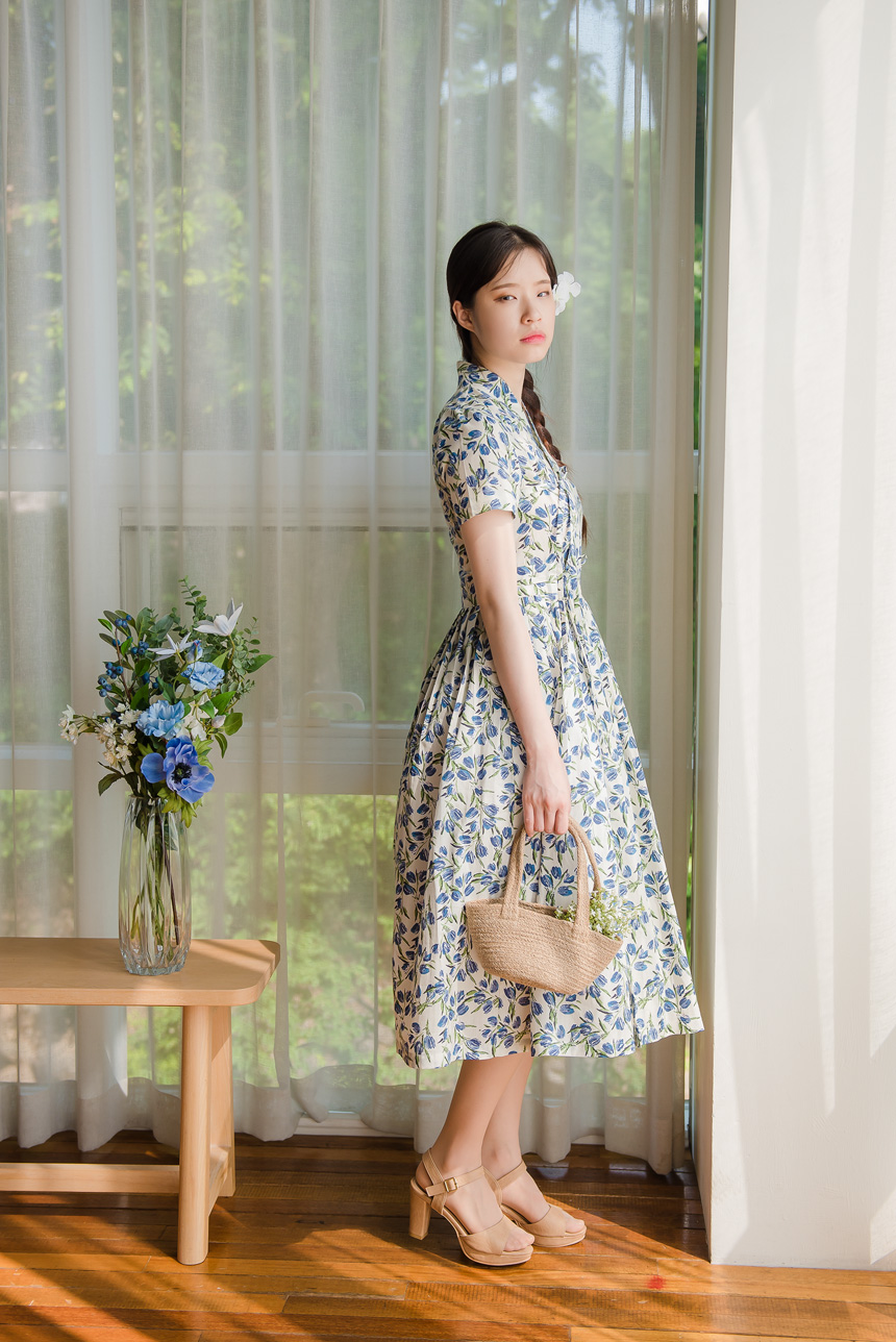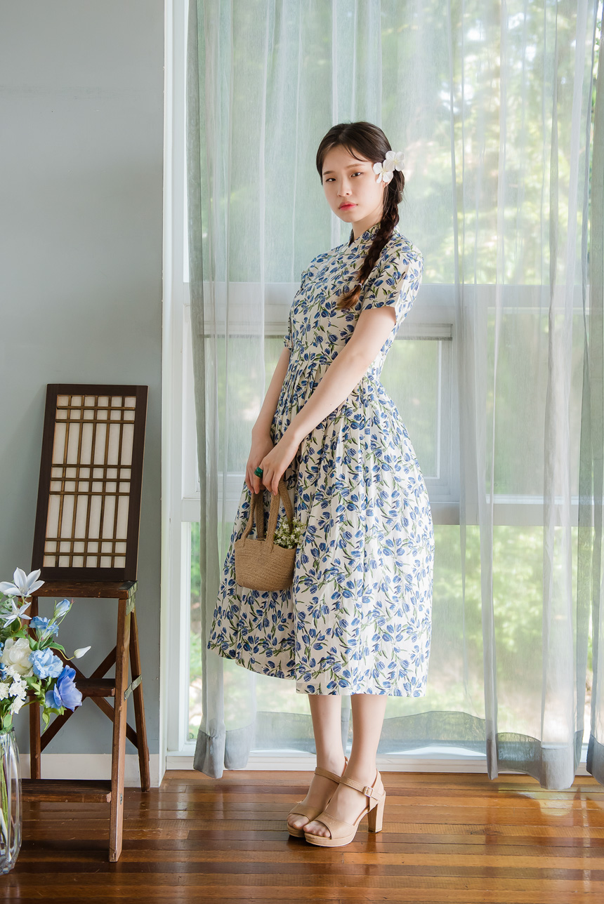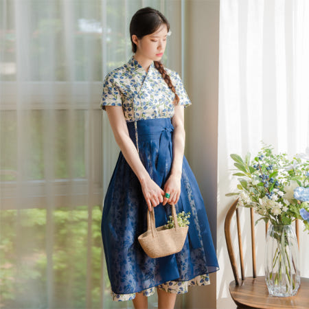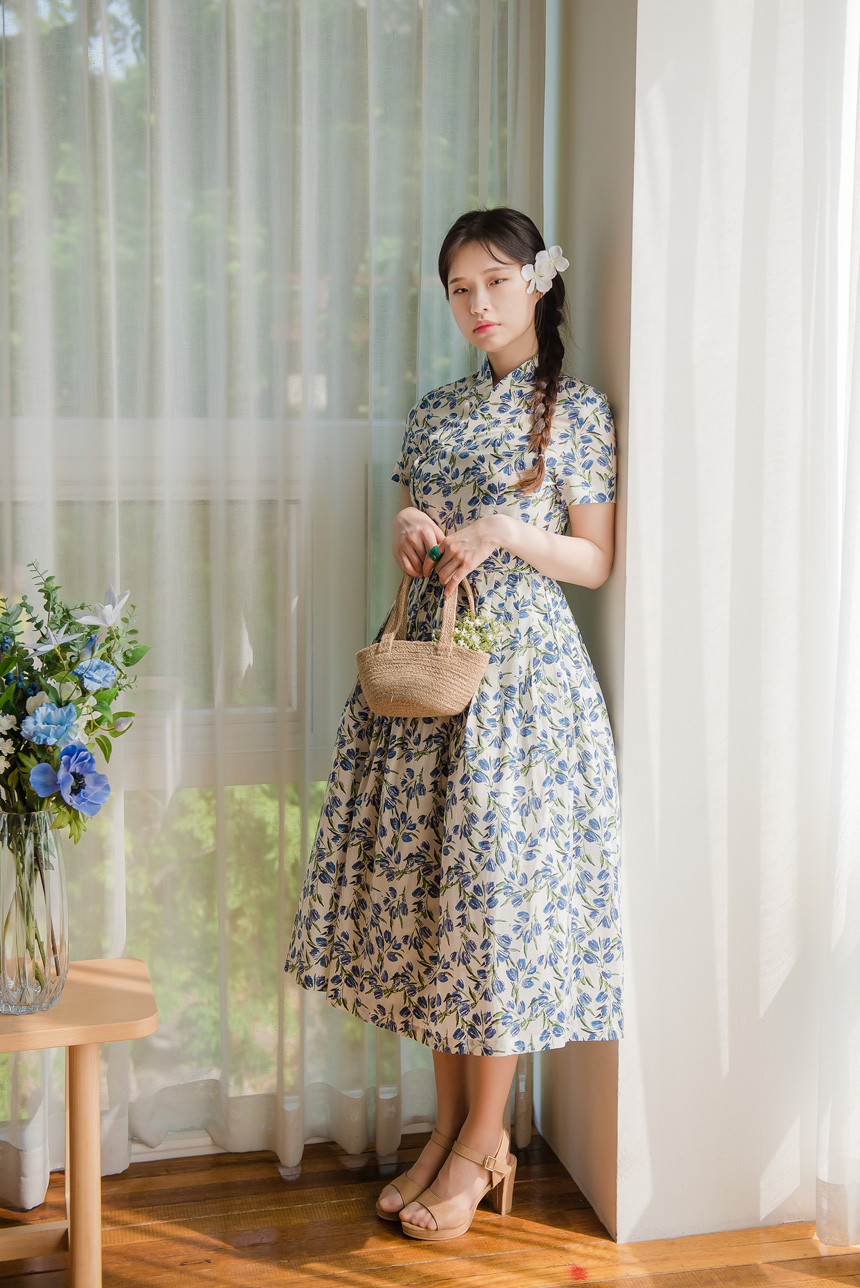 내츄럴한 아이보리빛 바탕에 푸른꽃과 초록잎이 그려져있는 철릭원피스로