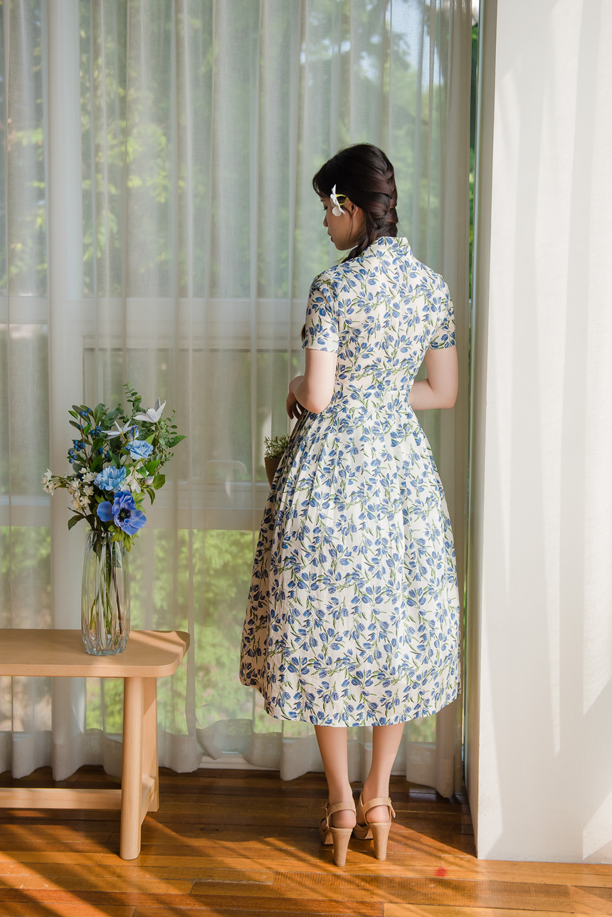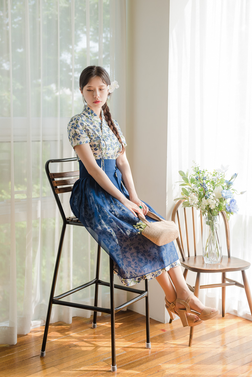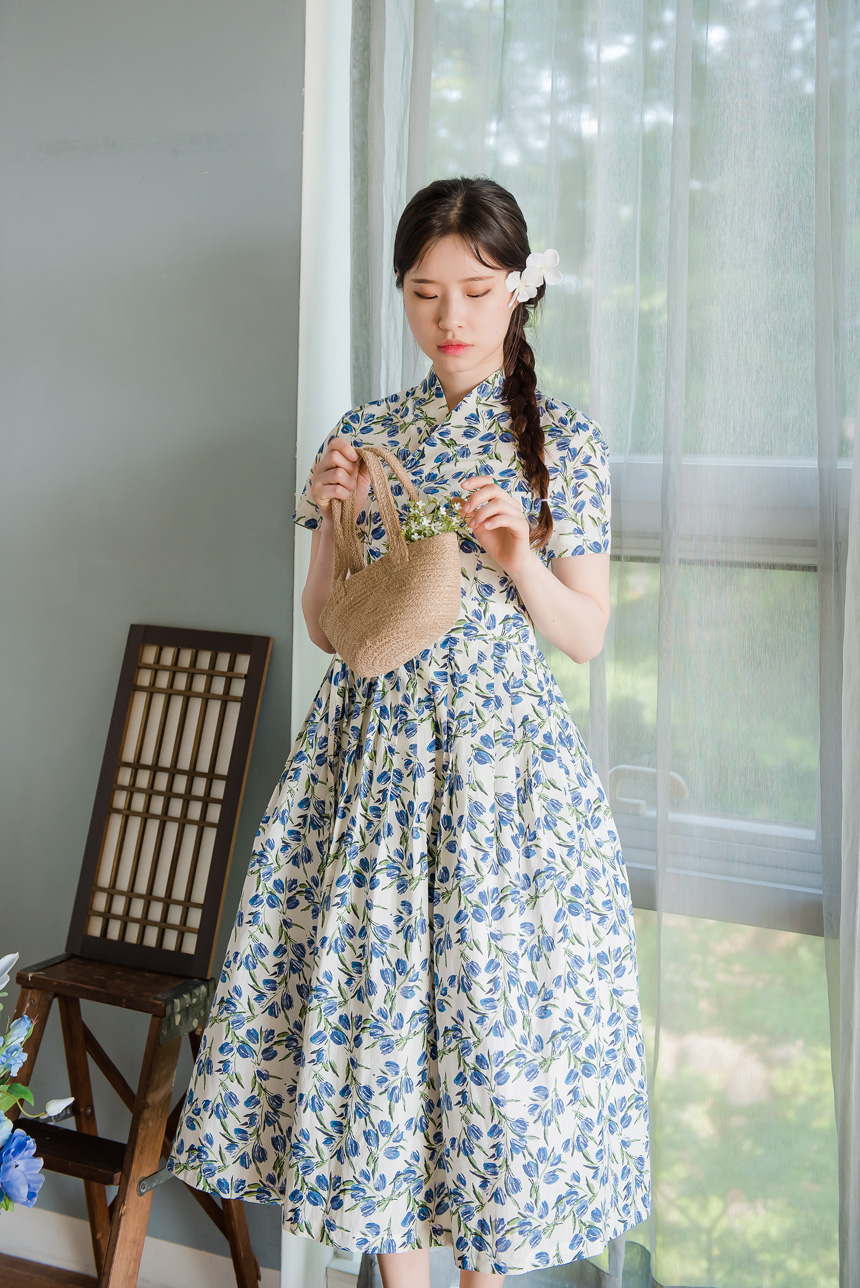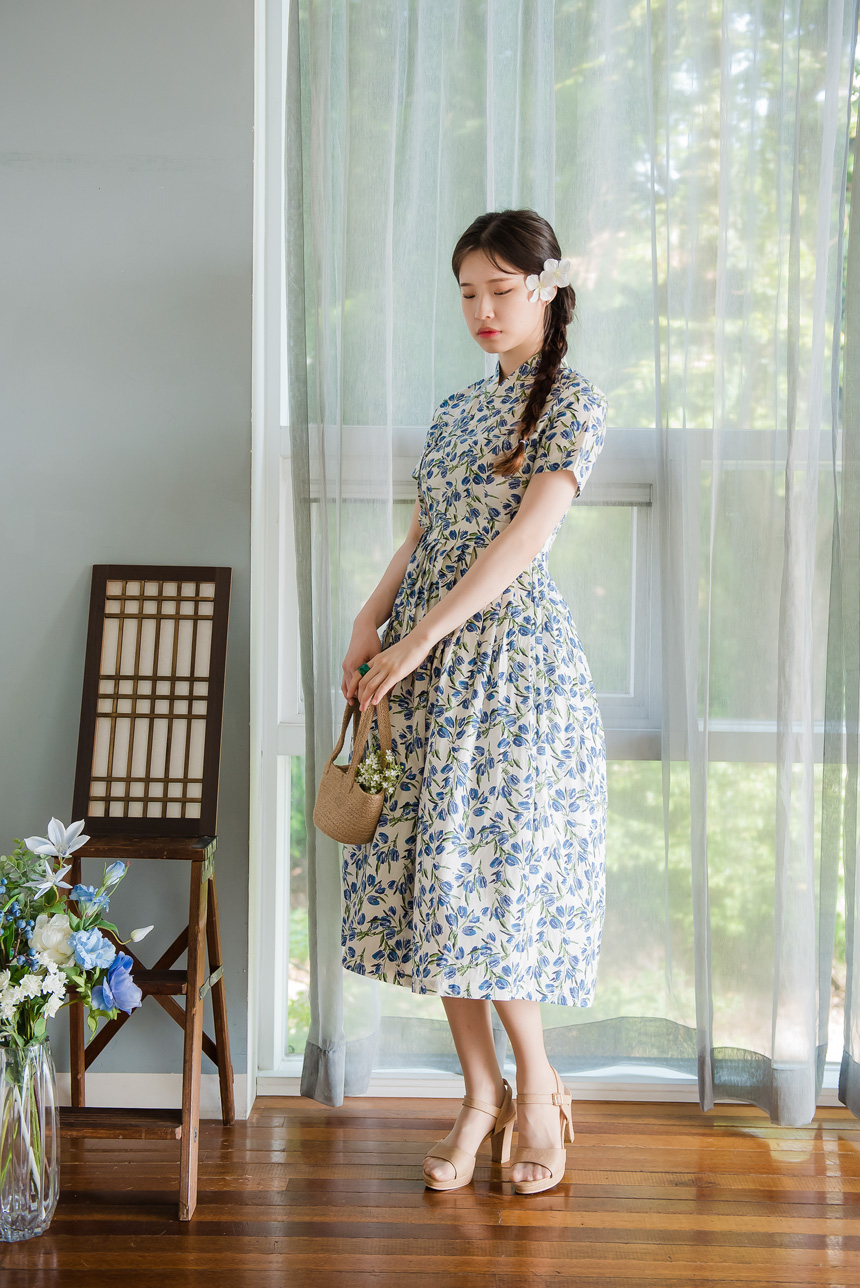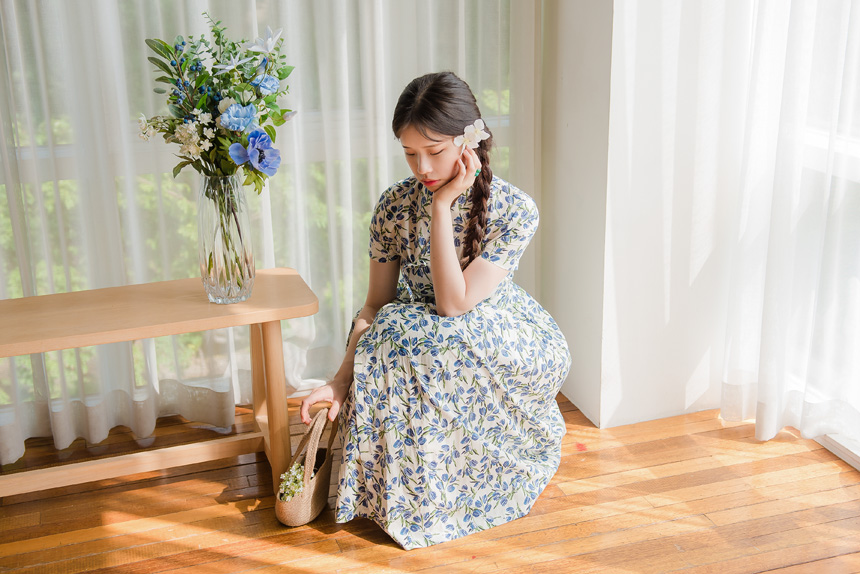 내츄럴한 아이보리빛 바탕에 푸른꽃과 초록잎이 그려져있는 철릭원피스로