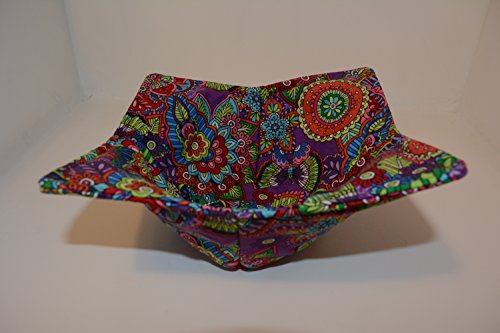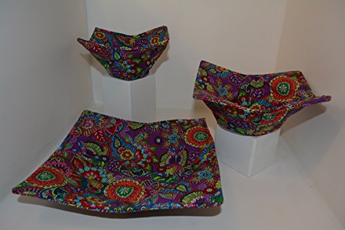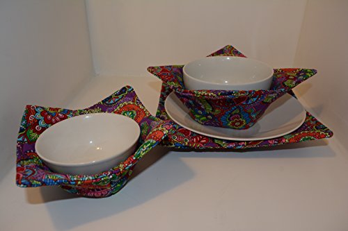 Product Description Microwave cozy set includes 1 small bowl cozy (Approx 6.5" sq), 1 medium bowl cozy (Approx 8" sq), 1 dinner plate cozy (Approx 10" sq.) The dinner plate cozy can also be used for round casserole dishes and the small size is great for coffee mugs! These microwave cozies are the perfect solution to handling super-hot dishes. Cooking and reheating food in a dish cozy makes life so much easier! Place your microwaveable dish inside the bowl cozy and put the whole thing in the microwave to heat. To take the bowl out, you simply grab the corners of the cozy. We found that our kids can now get their dishes out of the microwave safely. Cozies will also protect your fingers from the cold when holding a bowl of ice cream and are great for protecting your table. You can also use a cozy placed on top the dish you are microwaving to help steam food. MATERIALS: * 100% cotton fabric * 2 layers of 100% cotton batting * 100% cotton thread Please be advised: Bowl cozies must only be used in microwaves with a rotating base. To avoid scorching or burning, please make sure cozy freely rotates in your microwave. Never leave microwave unattended. Make sure cozy is clean with no pieces of food attached. Do not microwave cozy for more than three minutes. Cozies can be machine washed on delicate cycle. Reshape and allow to air dry for best results. Please let us know if this is a gift, and we will ship without a packing slip enclosed! 0