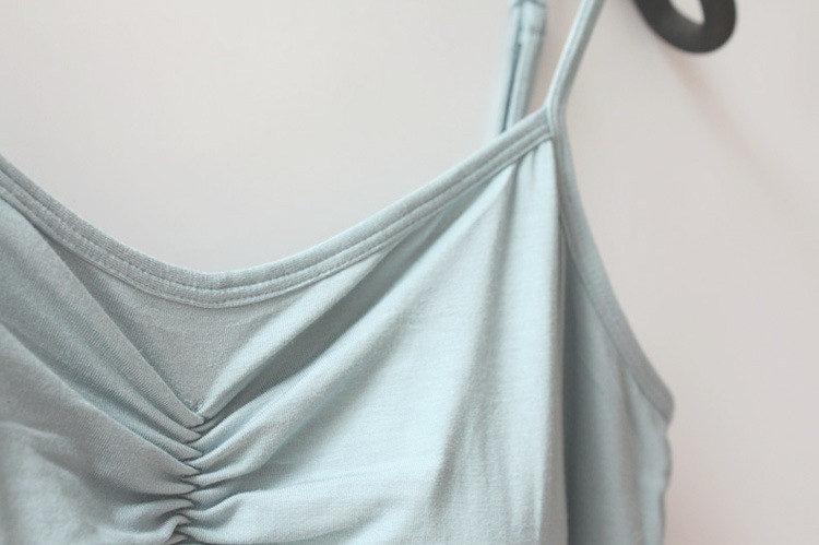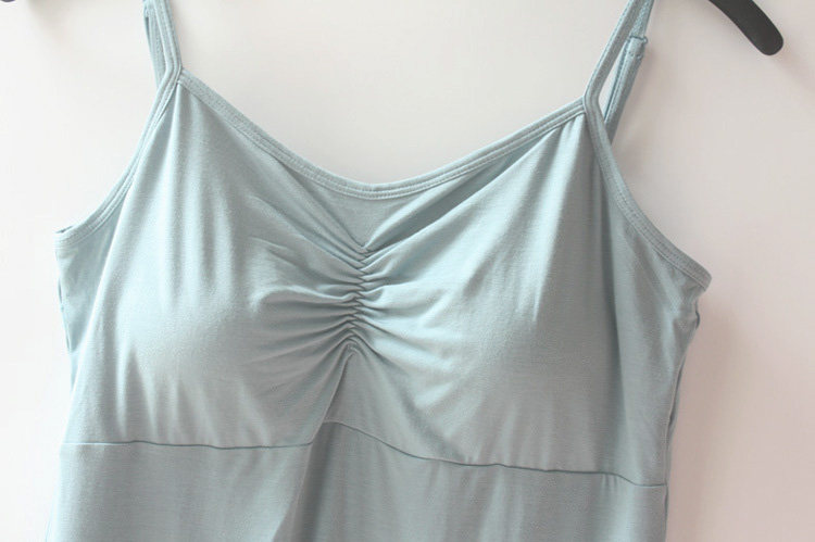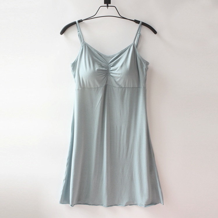 带胸垫,胸垫可以取出来,居家穿很实用,家里有其他的长辈或者晚辈,穿上这样的睡裙,不露点,很舒服!