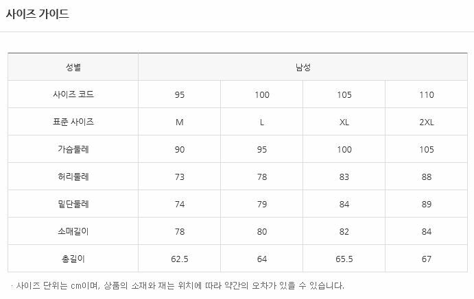 | 치수 | 실측(100)사이즈(cm)-가슴둘레92 소매길이82 총장66 |