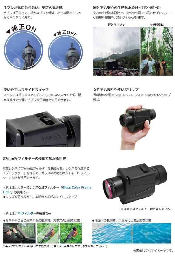 | 手ブレ補正機能付きで細かなブレを軽減をする単眼鏡。 |