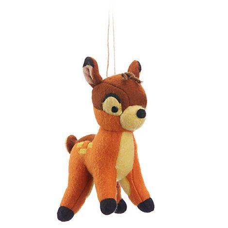 - Plush holiday ornament Retro folk art, ''handcrafted''' look and feel Felt-like fabric Embroidered detailing Yarn tuft String for hanging Fabric covered foam name tag: ''Bambi''