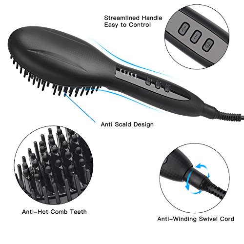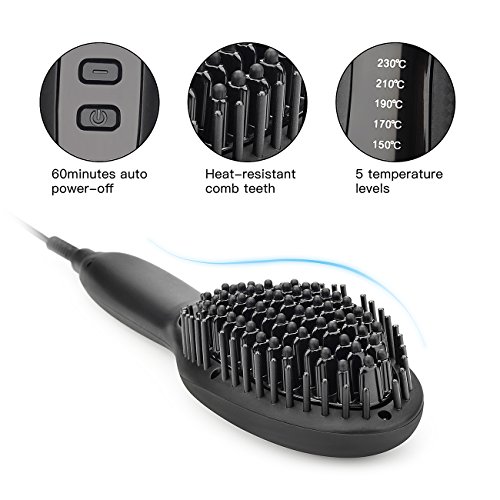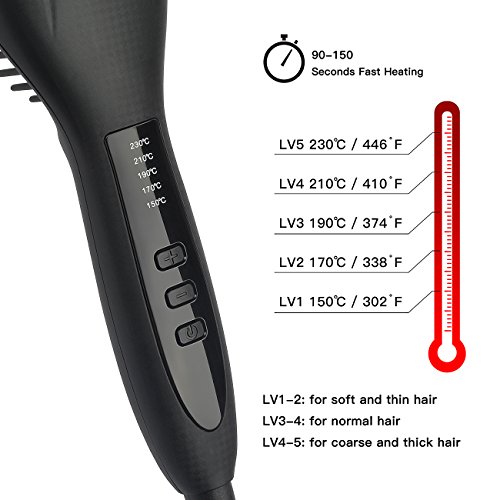 - Fast Heat-up: With stable and safe PTC heating element, this straighten brush heats up quickly in 90-150 seconds. Five temperature levels from 302°F to 400°F (150°C - 230°C) for different hair types: thin, thick, natural, fine, wavy or curled.