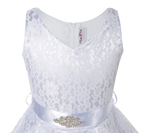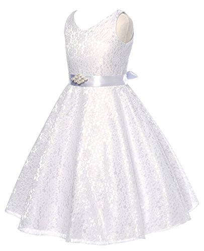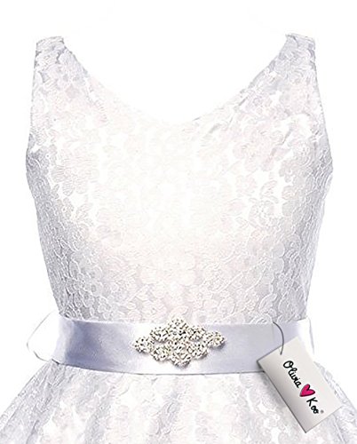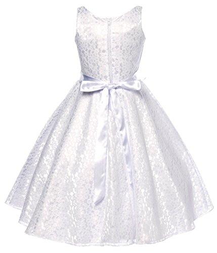 Very elegant dress with beautiful white lace overlayed bodice and double layered tulle skirt. Lovely charmeuse bow sash (attached) over the waistline adds finishing touch.