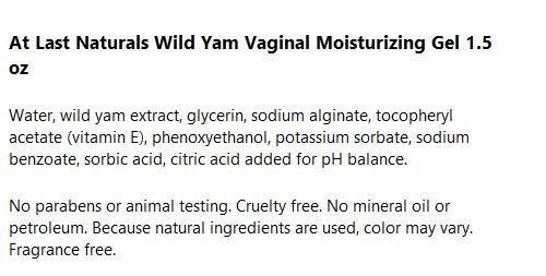 Studio : At Last Publisher : At Last Binding : Health and Beauty Product Description At Last Naturals Vaginal Moisturizing Gel is a delicate water based formulation that is fragrance free and non-irritating. This paraben-free wild yam vaginal gel can be used as frequently as needed. 0