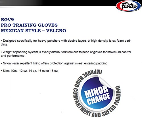 -. Binding : Misc. -. Brand : Bangplee_Sport -. Color : White Black Red -. Feature : Designed specifically for heavy punchers with double layers of high density latex foam padding. / Weight of padding system is evenly distributed from cuff to head of gloves for maximum control and performance. / Nylon water repellent lining offers protection against sweat entering padding / Fairtex Boxing Gloves BGV9 White Black Red color -. IsAutographed : 0 -. IsMemorabilia : 0 -. Label : Fairtex -. Manufacturer : Fairtex -. ProductGroup : Sports -. ProductTypeName : SPORTING_GOODS -. Publisher : Fairtex -. Size : 12 oz -. Studio : Fairtex -. Title : FAIRTEX BGV9 BOXING GLOVES WHITE BLACK RED COLOR MINOR CHANGE EDITION PRO TRAINING GLOVES MEXICAN STYLE - VELCRO Designed specifically for heavy punchers with double layers