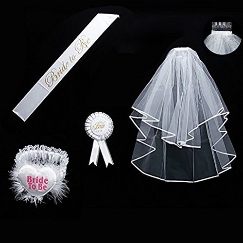 ✔Pack Includes:4 pcs as a set, including one wedding veil with comb, one satin sash, one rosette badge and one lacy garter.