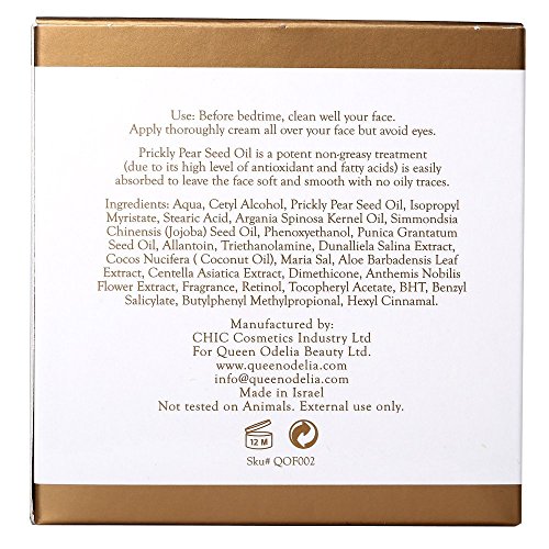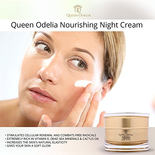 -. Binding : Misc. -. Brand : Queen Odelia -. EAN : 7290015717038 -. Feature : The formula works through the night to offer the skin all its beneficial and repairing active ingredients / The cream reduces the appearance of fine lines and of wrinkles / The cream is easily absorbed, softens the skin and restores its elasticity / Unique formula with Prickly Pear Seed oil and Dead Sea minerals / The jar contains 50ml e 1.7 oz -. Label : Chic Industries -. Manufacturer : Chic Industries -. Model : QOF002 -. MPN : QOF002 -. NumberOfItems : 50 -. PackageQuantity : 1 -. PartNumber : QOF002 -. ProductGroup : Beauty -. ProductTypeName : BEAUTY -. Publisher : Chic Industries -. Studio : Chic Industries -. Title : Queen Odelia Nourishing Night Cream with Cactus Oil and Dead Sea Minerals, 1.7 oz. - Formulated to recharge, revitalize and intensively nourish the skin overnight