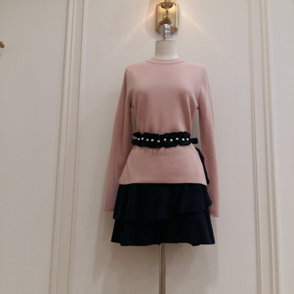 단정하면서 깨끗한 느낌의 풀오버로 벨트에 포인트를 줌.
