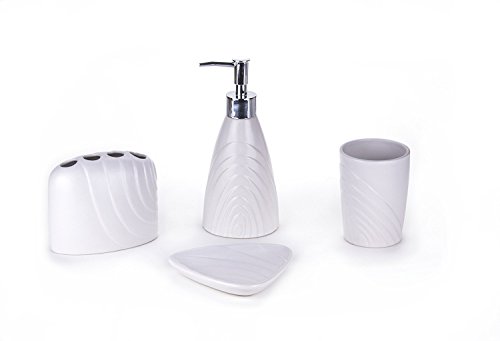 4 PIECE SET INCLUDES Tumbler, Soap Dish, Toothbrush Holder, and Soap Dispenser/ Lotion Dispenser.