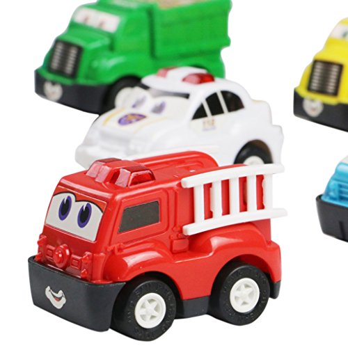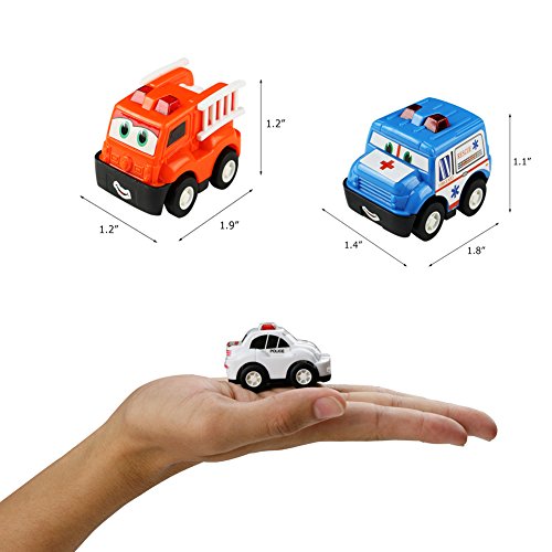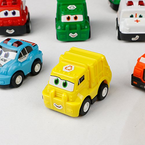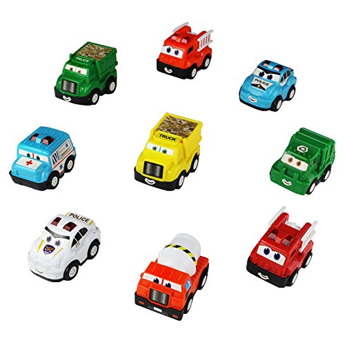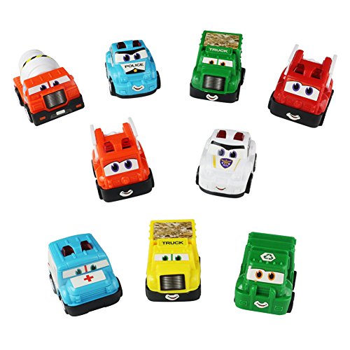 -. Feature : Toy car contains 2 police cars, 2 fire trucks, 2 dump trucks,1 cement truck,1 ambulance,1 garbage truck 9 piece in all. / Pull-back vehicles,all cars are friction,provide hours fun in party time,also suitable as kids reward. / Construction toys,help children learn about ambulance, police and modes of transport while playing with these car toys. / Truck toy and construction vehicles,designed with bright colors and cute cartoon faces,made of durable non-toxic plastic. / Package Size: 14.5" x 10"; Warning: CHOKING HAZARD-small parts. Not for children under 3 years.