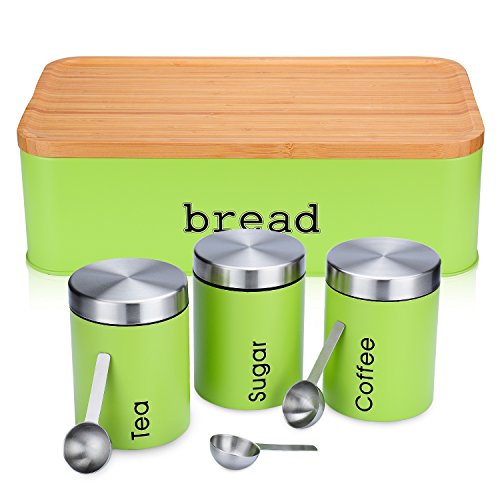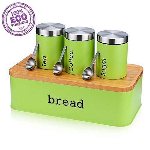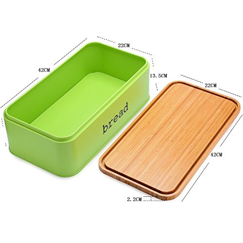 This gorgeous space saving large bread box with eco-friendly cutting board Lid will add style to your kitchen. Whatever style you are trying to achieve, it will work seamlessly in any modern, contemporary or vintage setting. Specifications: Color: Green ①. Large Capacity Bread Box:Bread bin storage has a spacious interior to store over sized loaves, baguettes, bread rolls, buns, loaf of bread, bagels and cupcake etc. ②. Both Side Usable Lid: One side of the Lids as cutting board with carved crumb catcher grooves promote cleanliness. No mess, no clean up. Meanwhile the other side of lid useful as a fruit bowl and serving dish set for fruits, crackers. ③. 3 Pcs Food Canisters and 3 Pcs Stainless Steel Spoon:3 Pcs Food Canisters has a lable for tea, coffee, sugar, The 3 Pcs Stainless Steel Spoons is perfect for your food cansiters. ④. Material: Food grade stainless steel and eco-friendly wooden ⑤. Care Instructions:The metal container of the bread box is dishwasher safe. The eco bamboo lid washes easily with a bit of warm soap and water. Package Including: 1*Pcs x Bread Box (5.4' x 9.9' x 16.6') 1*Pcs x Cutting Board Lid (0.9'x9.9'x16.6') 3*Pcs x Food Canister (4' x 4' x 5.5') 3*Pcs x Stainless Steel Spoons (0.9' x 1.8' x 4') Warranty: 3 Years Warranty for All SVVSS Bread Box 0 |