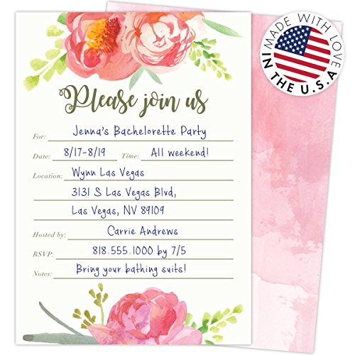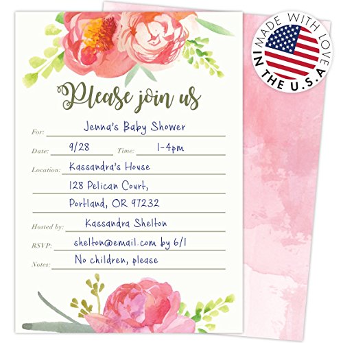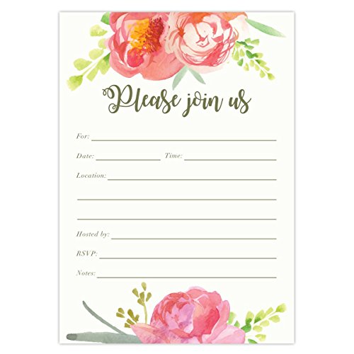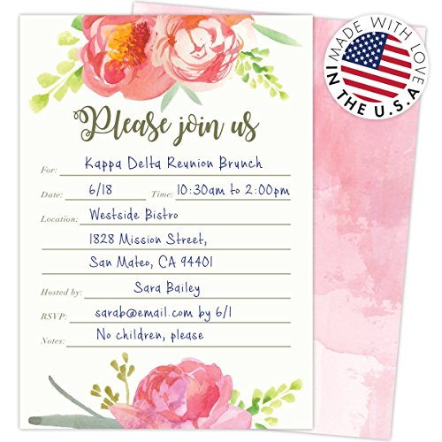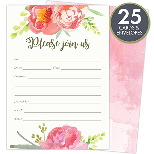 Pink Vintage Floral Set of 25 Fill-in Invitations and Envelopes for Soirees, Bridal Showers, Baby Showers, Birthdays, Graduations, Dinner Parties,...