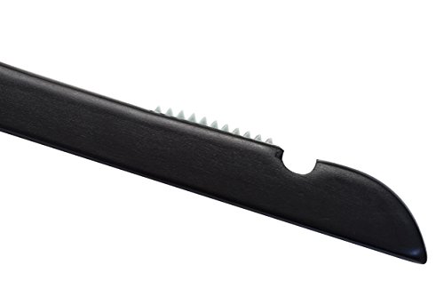 -. Feature : 17" hanger for blouses, shirts, jackets, and other garment tops / Wood with low-gloss black finish for strength and durability / Flat 1/2" thick profile to help minimize space required for hanging garments / Grippers on top of each arm for helping prevent garments from slipping off / Notch on top end of each arm for holding string straps