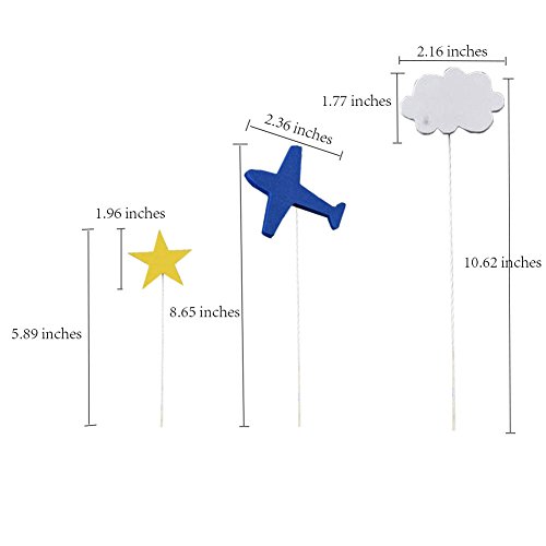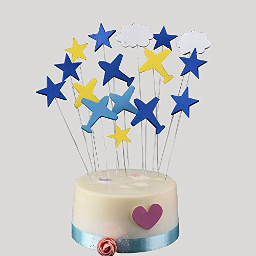 -. Feature : This set is perfect for Boy's Birthday Party, Family Party and Other Special Events. / These cute double sided cupcake toppers are the perfect addition to your food display. They can be used in a many different foods, sandwiches, deviled eggs, cheeses and variety of deserts. / Fresh Colors: This set is designed P.R.Imarily in Blue, secondarily in the White, Yellow, creating anairplane crossing the sky world. / Includes: 12Airplanes (4 dark blue, 4 light blue, 4 yellow), 12 dark blue stars, 6 clouds / Material: EVA Foam and thin wire sticks.