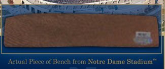 An actual authenticated slab of game used bench from the sidelines on the field at the stadium is mounted to an 8 inch x 10 inch wood-backed plaque featuring a collage of Notre Dame Stadium and brief description of the venue