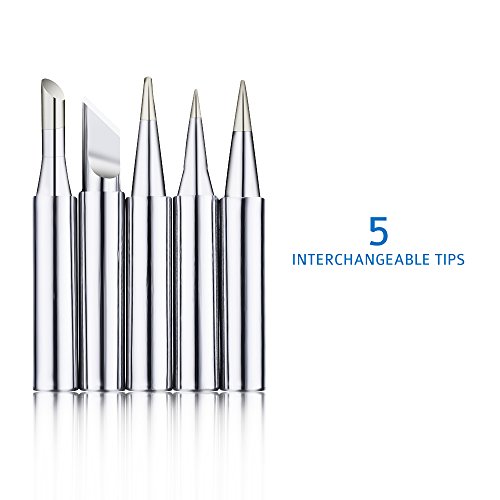 【More Accessories】Come with 5 PCS interchangeable tips for various types of jobs, A soldering stand for heat dissipation, Solder wire( 1mm in diameter, melting point: 183℃)