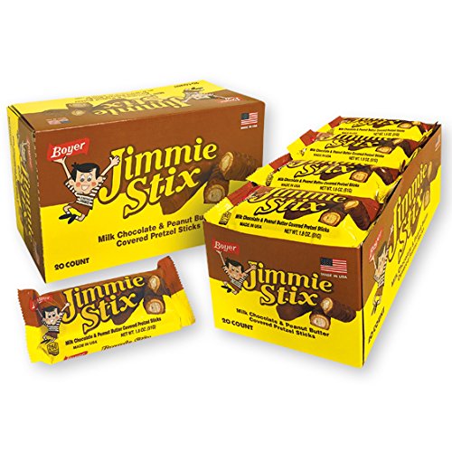 -. Feature : Smooth milk chocolate and creamy peanut butter wrapped around a salted pretzel rod. If you like peanut butter cups, Jimmie Stix will be your new obsession. This is Boyer Candies first new product in 25 years!!! Two pretzel rods in each package. 20 packages in each box. / Made in the USA / Play money for merchandise inside each pack / 20 ct. box (2pk. 40 pretzel sticks total)
