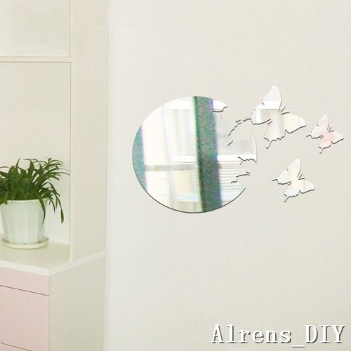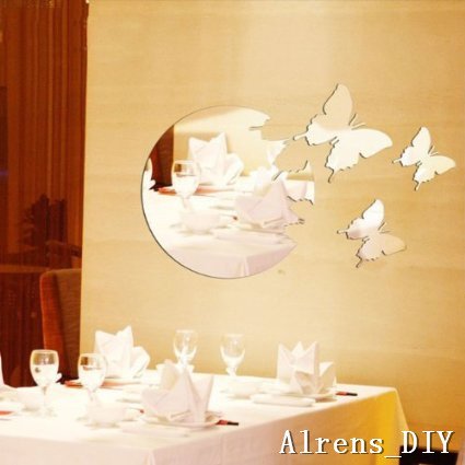 Silver 3 Butterflies Flying from the Round Moon Sun Crystal Reflective DIY Mirror Effect 3D Wall Stickers Home Decoration Decor Mural Decal adesivo de parede Removable