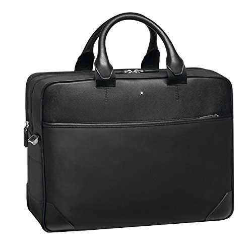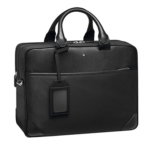Product Description The Montblanc Sartorial Jet collection combines clean elegance and lightness, thanks to the combination of black saffiano-print calf leather and plain water- and scratch-resistant black nylon fabric with a satin finish. The Document Case Large, which features one zipped pocket on the front panel, is composed of 2 main compartments with zip closures: one is padded and can hold a laptop along with its accessories in the other 2 open pockets; the other can accommodate A4-size documents and is equipped with 2 open pockets for mobile phones, three loops for writing instruments and one zipped pocket. The bag can be carried using the 2 leather covered handles or the detachable and adjustable branded nylon shoulder strap. The back of the Document Case also features a satellite system to attach the bag to a trolley's handles. The bag comes with a leather-covered luggage tag with transparent view. 0