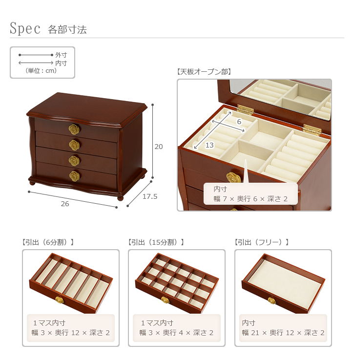 ■ 引出内寸:(約)幅21×奥行12×深さ2cm■ 1マスサイズ(天板下):(約)幅7×奥行6×深さ2cm■ 1マスサイズ(引出1段目):(約)幅3×奥行4×深さ2cm■ 1マスサイズ(引出2段目):(約)幅3×奥行12×深さ2cm■ 1マスサイズ(引出3段目):(約)幅21×奥行12×深さ2cm